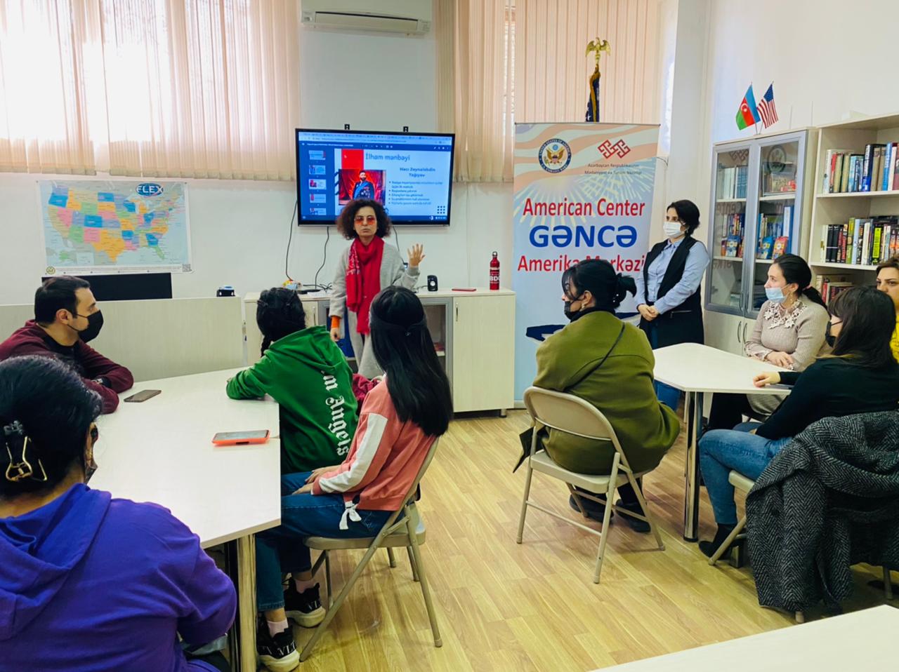 Gəncə Regional Mədəniyyət İdarəsi Gəncə şəhər Mərkəzləşdirilmiş Kitabxana Sistemində fəaliyyət göstərən Gəncə Amerika Mərkəzində Təlimçi: Sara Rəcəbli (sosial sahibkar, "BUTA Art & Sweets" və "Sosial Biznes Gənclər Mərkəzi"-nin təsisçisi ) Sosial sahibkarlıqla bağlı təlimi keçirilmişdir.