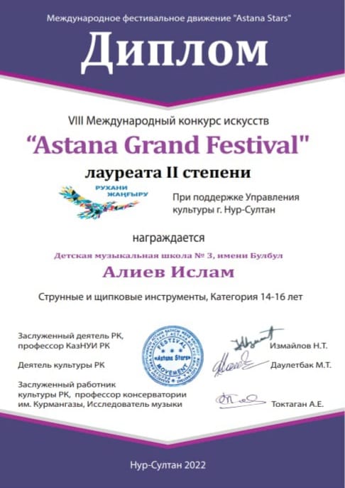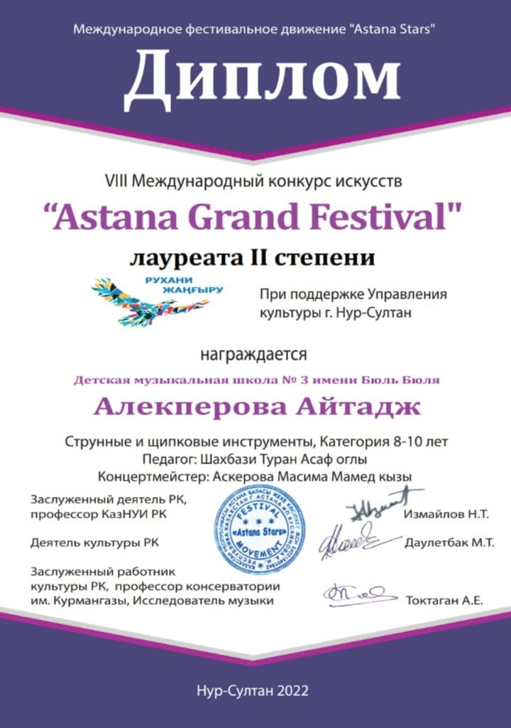 Gəncə Regional Mədəniyyət Idarəsinin tabeliyində olan Bülbül adına 3 saylı Uşaq Musiqi Məktəbinin simli alətlər şöbəsinin şagirdləri "Аstana Grand Festival" 8 çi Beynəlxalq incəsənət müsabiqəsinin qalibləri sırasında olmuşdur. Müəllimlər Şahbazi Turan, konsertmeyster Əsgərova Məsmə və İsgəndərova Gülnar, konsertmeyster Məmmədova Nərmin.