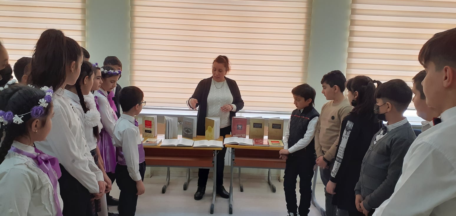 Çıxışından sonra böyük kitabxanaçı Mirvari Cəfərova sərgidə nümayiş olunan kitablarla iştirakçıları tanış etdi.