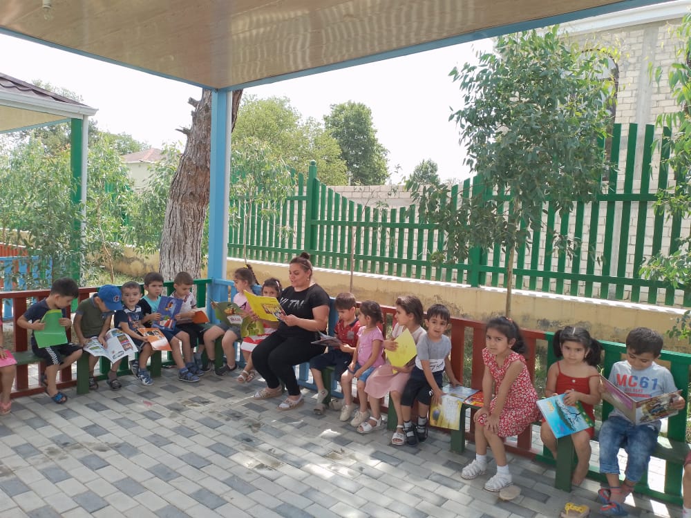 Uşaq şöbəsinin baş kitabxanaçısı Gülər Aslanova balacalara" Boz pişik və Qara pişik "nağılını oxudu. Açıq havada təşkil olunan nağıl saatında balacaları kitabxanamıza yeni daxil olmuş nağıl kitabları ilə də tanış etdik.