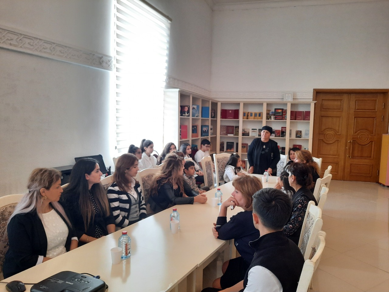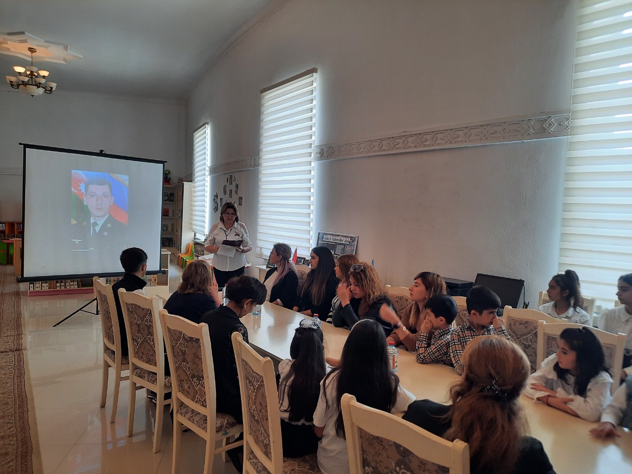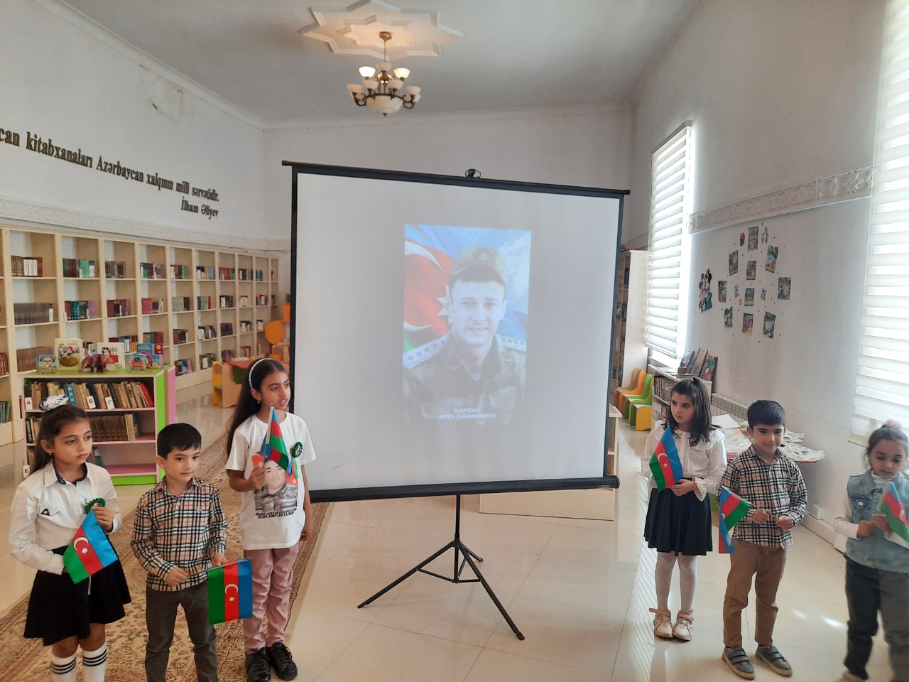 Gəncə Regional Mədəniyyət İdarəsi Gəncə şəhər Mərkəzləşdirilmiş Kitabxana Sisteminin Mərkəzi Kitabxananın Uşaq şöbəsində 10.08.22-ci il tarixində “Müharibə uşaqların gözü ilə”adlı II Vətən müharibəsində qəhrəmancasına şəhid olmuş Arazov Səyyar Güloğlan oğlu, İsgəndərov Arzu Seymur oğlu,Qasımov Nicat Elşən oğlu və Qasımov Ramal Saleh oğlunun ailə üzvləri və övladları ilə görüş keçirildi. Tədbirdə Gəncə şəhər 26,32 №-li məktəbin müəllim və şagirdləri iştirak etdilər. TədbirAzərbaycanın ərazi bütövlüyünün qorunması, bərpası, tarixi torpaqlarımızın işğaldan azad edilməsi uğrunda döyüşlərdə şəhidlik zirvəsinə ucalan qəhrəman oğulların xatirəsinin bir dəqiqəlik sükut olaraq yad edilməsi ilə başladı. Şöbənin müdiri Ellada Rəhimova tədbiri açıq elan edərək bildirdi ki, hər günü, hərsaatı xalqımızın şanlı tarixinə şərəflə, qürurla yazılmış 44 günlük Vətən müharibəsi millətimizin yenilməzliyini və birliyini dünyaya bir daha sübut etdi. 44 günün demək olarki, hər günündə düşmən üzərində parlaq qələbə qazanaraq ərazilərimiz işğaldan azad edildi, yağı düşmən əzəli və əbədi torpaqlarımızdan qovuldu. Hər gün ordumuz düşmənin yaratdığı "güclü ordu” mifini darmadağın edərək kəndləri, qəsəbələri, yüksəklikləri mənfur düşməndən təmizləyib üçrəngli bayrağımızı azad etdikləri ərazilərdə dalğalandırdılar. Bütün dünya Azərbaycan əsgərinin, Azərbacan zabitinin qəhrəmanlığını bir daha gördü. Tədbirdə adları çəkilən hər bir şəhid haqqında ətraflı məlumat verildi. Şəhid Qasımov Nicat Elşən oğlunun anası Nərminə ana oğlu ilə bağlı xatirələrini danışaraq onun vətənini, xalqını necə sevməsindən söhbət açdı. Tək təsəllisi isə övladının qisasının alınması və yaddan çıxarılmamasının olduğunu vurğuladı.Şəhid Arazov Səyyar Güloğlan oğlunun həyat yoldaşı Arazova Yeganə və Qasımov Ramal Saleh oğlunun həyat yoldaşıQasımova Şəhla xanım xatirələrini bölüşərək onların yoxluqlarını hələdə qəbul edə bilmədiklərini gözəl ata, səmimi və diqqətli həyat yoldaşı, cəsur və ən əsasıda vətənini canındanda artıq sevən bir azərbacanlı olduqlarını vurğuladılar. Görüşdə iştirak edən AYB-nin üzvü,şairə Aləmzər Əlizadə,26 №-li məktəbin müəlliməsi Aytəkin Nəzərova, 32 №-li məktəbin müəllimələri LaləDaşdəmirova,Samirə Səfərova, Mehriban Həsənova öz çıxışlarında bildirdilərki, tarixə qızıl hərflərlə yazılmış 2020-ci ilin 27 sentyabr günü yaddaşlardan silinməyərək əbədi qalacaqdır. Azərbaycan ordusu döyüş meydanında canını-qanını verərək tarixi ədaləti bərpa etdi. Bu qələbədə payı olan qəhrəman oğullarımızla bu gün hər birimizin qürur duyduğunu və onların gələcək nəsillərə örnək olduqlarını qeyd etdilər.Tədbirdə adları çəkilən şəhid övladları və 32 №-li məktəbinyuxarı sinif şagirdləri vətənpərvərliyə, şəhidlərə, qələbəyə həsr olunmuş şeirlər səsləndirdilər. Sonda AYB üzvü, yazıçı Gülzar İbrahimovanın şəhid uşaqlarına göndərdiyi hədiyyələr uşaqlara təqdim olundu.
