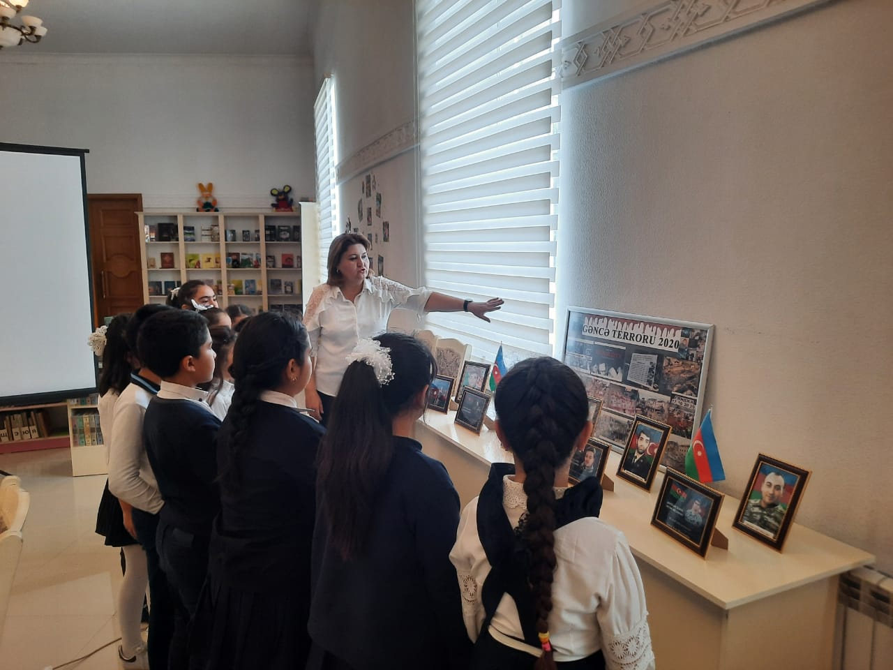 Gəncə Regional Mədəniyyət İdarəsi Gəncə şəhər Mərkəzləşdirilmiş Kitabxana Sisteminin Mərkəzi Kitabxananın Uşaq şöbəsində 14.10.2022-ci il tarixində “Tarixin Gəncə səhifəsi” başlığı altında söhbət keçirildi. Tədbiri şöbənin müdiri Ellada Rəhimova apararaq bildirdi ki, 44 günlük vətən müharibəsində ağır məğlubiyyətlərə uğrayan düşmən öz çirkin əməllərini davam etdirməkdən çəkinmədilər. Çox təhlükəli raket sistemindən istifadə edərək Gəncə əhalisini 5 dəfə ayrı-ayrı vaxtlarda bütün beynəlxalq hüquq normalarını pozaraq atəşə tutdular. Bu çox dəhşətli və insanlıqdan uzaq olan bir cinayət və Xocalı soyqırımından sonra Azərbaycan xalqına qarşı həyata keçirilən yeni bir dəhşətli faciə idi. Hər zaman olduğu kimi onlar dinc əhaliyə qocaya, qadına,uşağa qarşı amansızlıq etdilər. Qeyd etdi ki, xalqımızın qan yaddaşında əbədi yaşayacaq olan Gəncə terroru heç zaman unudulmayacaq və gələcək nəsillərə ötürüləcək. Tədbirdə şagirdlər kitabxanada təşkil edilmiş Gəncə terroruna həsr olunmuş fotostendlə tanış oldular. Tədbirdə 27 saylı-məktəb liseyin bir qrup şagirdləri iştirak etdilər.