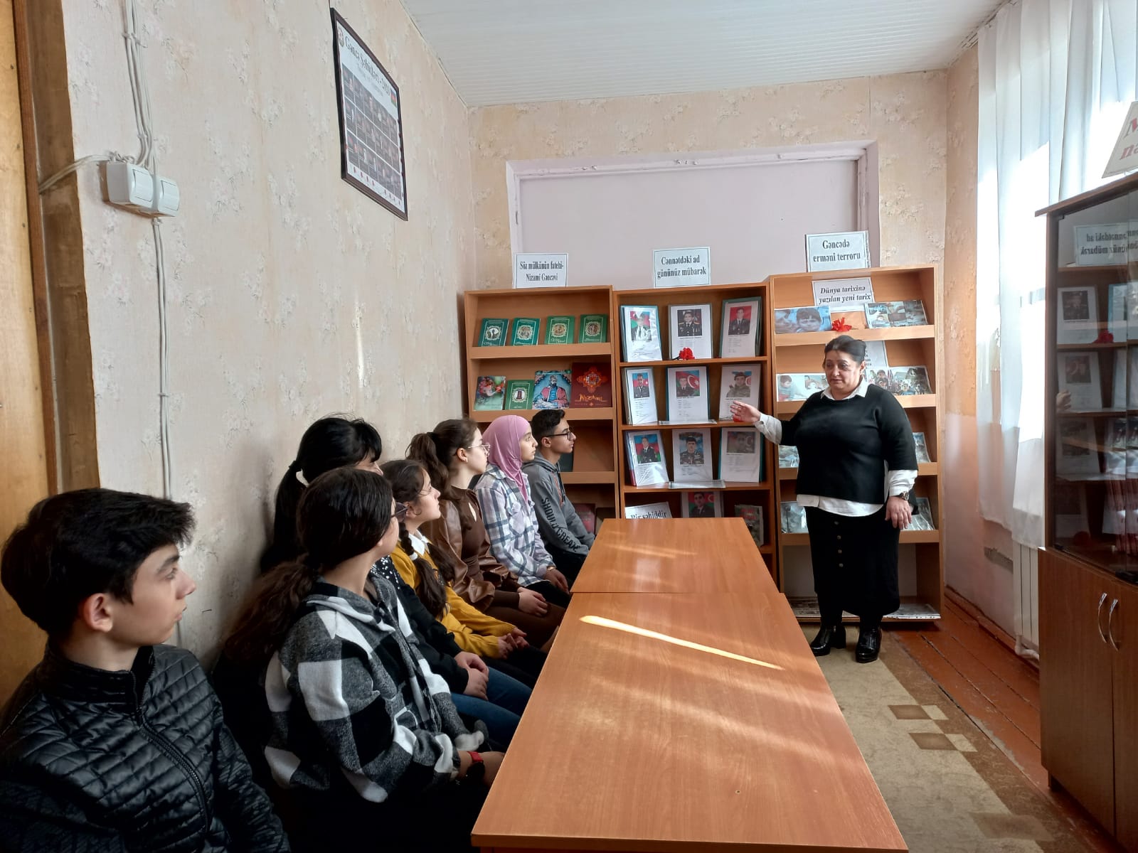Prezidentimiz İlham Əliyevin dəmir yumruğu və müzəffər Milli Ordumuzun şanlı qələbəsi ilə 44 gün ərzində xalqımızın parlaq zəfəri ilə həll olundu.Bu müharibədə millətimizin qəhrəman övladları öz qanlarından və canlarından keçdilər.Kitabxanaçı doğum günləri oktyabrda olan şəhidlər- Kəlbəliyev Səyavuş,Bayramov Ramin,Bədəlov Valeh,Rəşad Sadıqov,Əsgərov Samid,Piriyev Səttər və s.şəhidlərimizin həyatı və döyüş şücaətləri haqqında, ölümündən sonra Prezident İlham Əıiyevin sərəncamı ilə təltif olunduqları adlar, medal və ordenləri haqqında məlumat verdi.Sonra kitabxananın əməkdaşı iştirakçıları tədbirdə adı gedən şəhidlərimizə həsr olunmuş sərgi ilə tanış etdi.Tədbirin sonunda kitabxanaçı vurğuladı ki,bu gün biz gələcək nəsillərə nümunə olan şəhidlərimizin qarşısında baş əyirik.