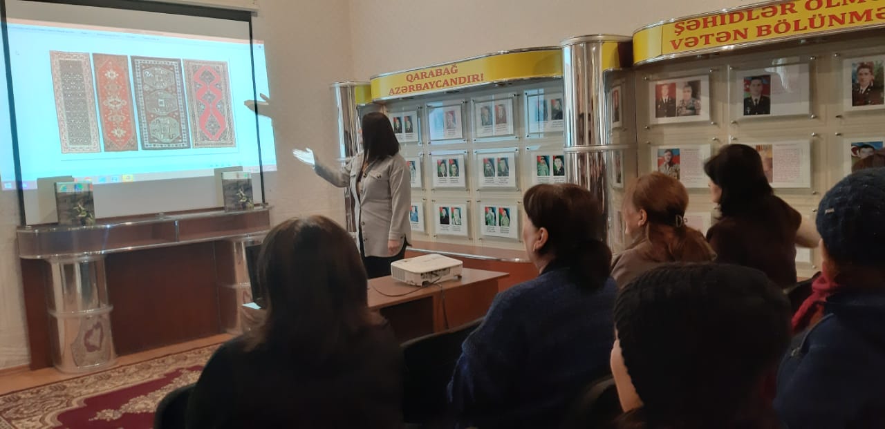 Oxuculara Xidmət şöbəsinin kitabxanaçısı Nuriyeva Sevda çıxış edərək  qeyd etdi ki, Şuşa şəhəri  tarixən  Qarabağın əsas xalçaçılıq mərkəzlərindən biri olmuşdur. Burada xalça toxuculuğu XVIII əsrin ikinci yarısından başlamış, XIX əsrdən isə yüksək inkişaf dövrü keçirmişdir. Toxunan xalçalar xarici ölkələrə də ixrac olunurdu. Xalça tacirlərinin xüsusi marağına səbəb olan bu nümunələr  rəng həllinə və kompozisiya quruluşuna görə çox möhtəşəmdir.