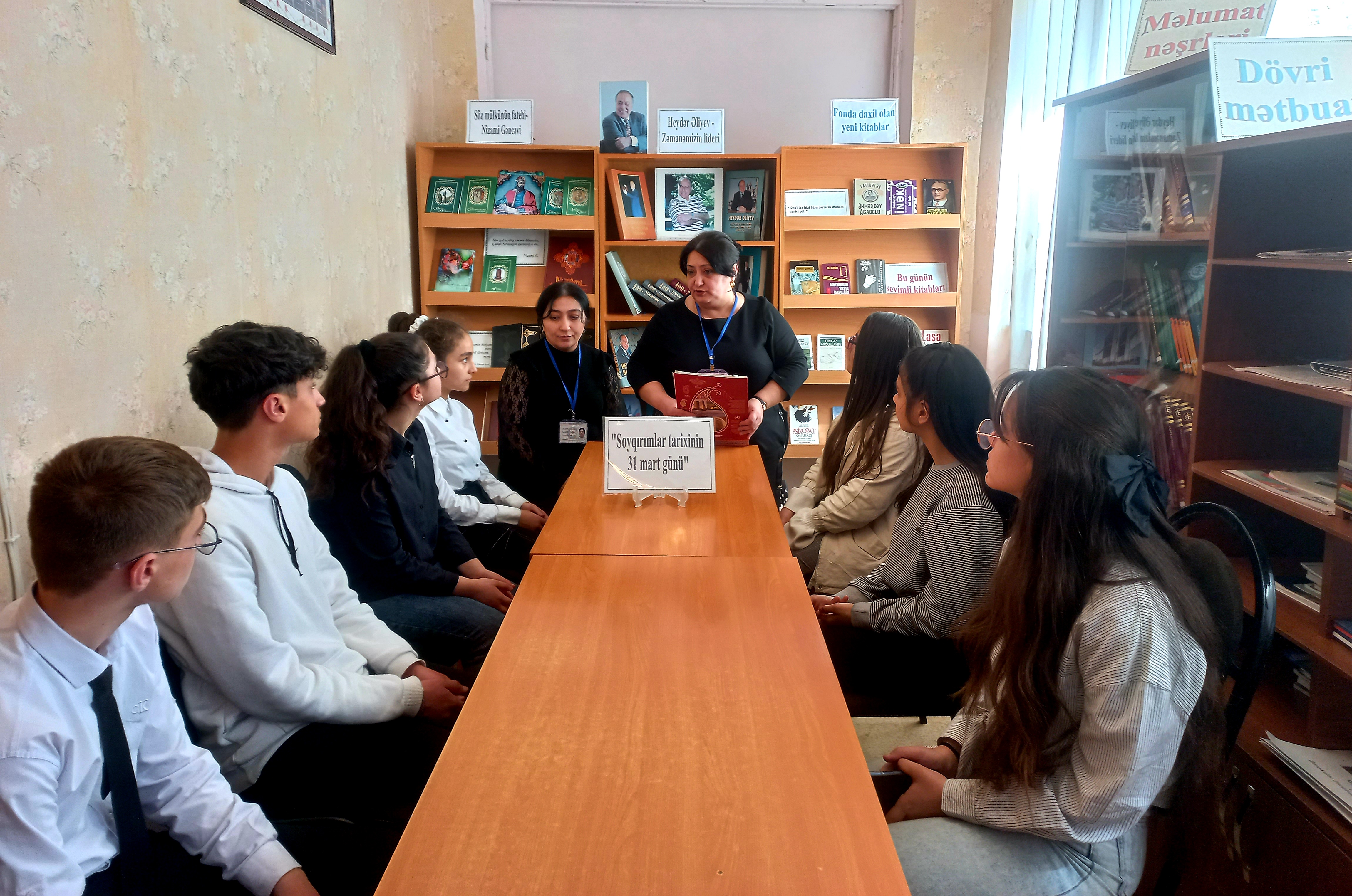 Gəncə Regional Mədəniyyət İdarəsi Gəncə şəhər Mərkəzləşdirilmiş Kitabxana Sisteminin 7 saylı kitabxana filialında 29.03.2023-cü il tarixdə 31 mart - Azərbaycanlıların Soyqırımı Günü ilə əlaqədar " Soyqırımlar tarixinin 31 mart günü" adlı anım günü keçirildi.Tədbir soyqırım qurbanlarının, Azərbaycanın azadlığı, müstəqilliyi və bütövlüyü uğrunda həlak olmuş şəhidlərin əziz xatirələrinin bir dəqiqəlik sükutla yad edilməsi ilə başladı.Kitabxnanın müdiri Natella Hacıyeva və böyük kitabxanaçı Könül Mirxudayeva 105 il bundan əvvəl erməni daşnakları tərəfindən xalqımıza qarşı törədilən 31 mart soyqırımının cinayətləri haqqında iştirakçılara məlumat verdilər, eyni zamanda kitabxananın fəal oxucuları şeir parçaları ilə soyqırımın acı həqiqətlərini iştirakçılara çatdirdilar .