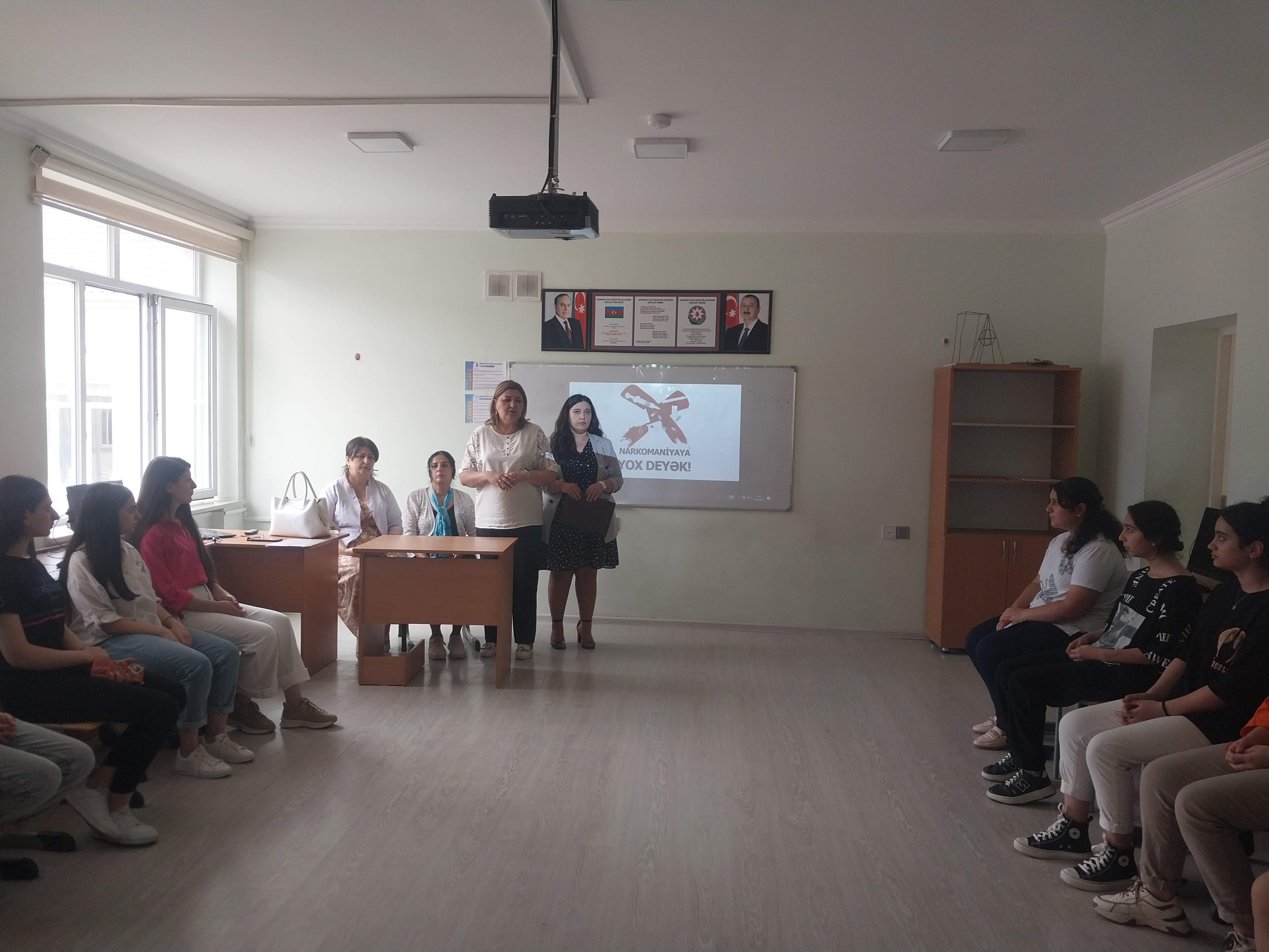 bəlalarından olan narkomaniya və onun fəsadlarından, gətirdiyi faciələrdən məlumat verdi. Bildirdi ki, bəşəriyyətin gələcəyi üçün ən dəhşətli bəla olan narkomaniyaya qarşı mübarizə yalnız dövlətin deyil, eləcədə cəmiyyətin hər bir üzvünün fəal rol oynaması zəruridir. Tədbirdə iştirak edən məktəbin təşkilat rəhbəri Vüsalə Məmmədova və tibb bacısı Afaq Sadıxova məktəblilərə bu məhvedici xəstəliyə düçar olmaması üçün nələrə